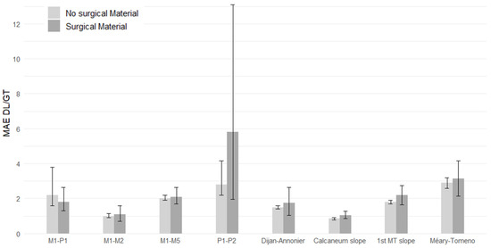 In the 40-foot views subset, the DL solution was closer to the ground truth than the radiologist (MT) for all foot angles except for the M1-M5 angle, the P1-P2 angle, and the first metatarsal slope (Figure 8).