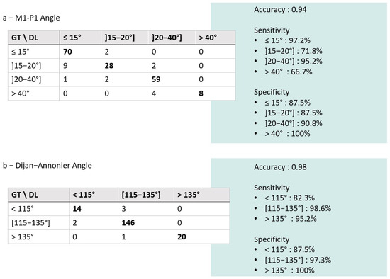 The confusion matrices and accuracy of the DL solution for (a) the M1-P1 angle and (b) the Djian–Annonier angle at given thresholds. For M1-P1, an angle of >15° indicates hallux valgus. We considered a grading scheme for the hallux valgus as follows: mild [15–20°], moderate [20–40°], and severe >40°. For Djian–Annonier, an angle <115° indicates an arched foot, and >135° indicates a flat foot. Note: Data are the number of cases per category. DL = deep learning solution; GT = ground truth.