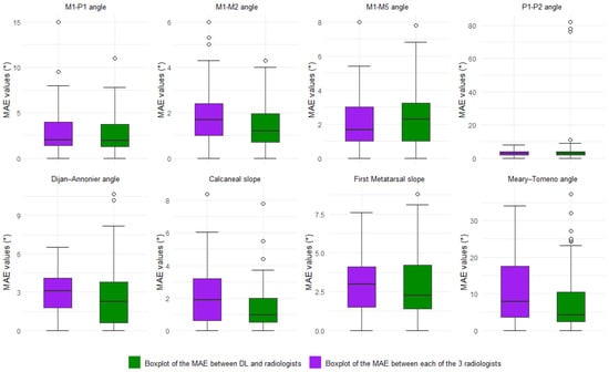 Boxplots of the MAE values between radiologists and DL measurements for each angle. Within each box, horizontal black lines denote median values; boxes extend from the 25th to the 75th percentile of each group’s distribution of values; vertical extending lines denote adjacent values (i.e., the most extreme values within the 1.5 interquartile range of the 25th and 75th percentile of each group). Dots denote observations outside the range of adjacent values.