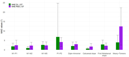 The MAE values for the radiologist and DL measurements compared to the GT for each angle. Note: MAE = mean absolute error; DL = deep learning solution; GT = ground truth; RAD = radiologist. Error bars are standard deviations.