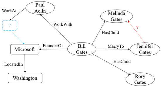 From the diagram, by reasoning based on the known triplets (Bill Gates, MarryTo, JenniferGates) and (Bill Gates, HasChild, MelindaGates), the missing relationship between (JenniferGates, ?, MelindaGates) can be inferred as HasChild, resulting in the completion of the triplet (JenniferGates, HasChild, MelindaGates). Similarly, from the triplets (Bill Gates, Founder of, Microsoft) and (Bill Gates, WorkWith, PaulAllen), it is deduced that the missing tail entity for (PaulAllen, WorkAt, ?) is Microsoft, thereby establishing the new triplet (PaulAllen, WorkAt, Microsoft).