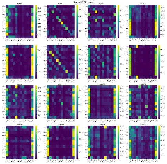 In multi-head attention architectures such as BERT-Large, each attention head is designed to capture distinct types of token-level dependencies, including syntactic, semantic, and positional relationships. During training, attention heads that are more aligned with task-specific objectives—such as modeling entity–relation or relation–tail interactions in link prediction—tend to receive stronger gradient updates. This leads to progressively sharper and more discriminative attention patterns. As illustrated in Figure 6 and Figure 7, which visualizes the attention maps of Layer 23 for sample, the BRA-enhanced model demonstrates that several attention heads consistently focus on semantically critical tokens, highlighting the model’s ability to align with predictive features in an interpretable manner.