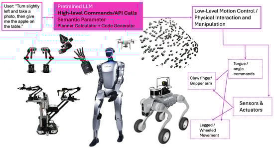 - Jeong, H.; Lee, H.; Kim, C.; Shin, S. A Survey of Robot Intelligence with Large Language Models. Appl. Sci. 2024, 14, 8868. [Google Scholar] [CrossRef]