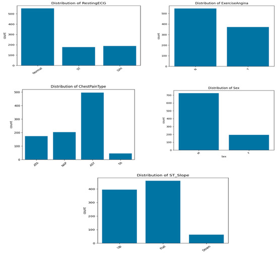 On the other hand, the dataset includes several categorical variables (Figure 1) that provide clinically relevant information for cardiovascular disease prediction. Regarding five distribution, the cohort is predominantly male, with 725 men (79.0%) and 193 women (21.0%), indicating a significant sex imbalance. The variable ChestPainType shows that the most frequent type is asymptomatic pain (ASY), affecting over half of population, followed by non-anginal pain (NAP) and atypical angina (ATA). Typical angina (TA) is rare, reported in less than 50 cases. This suggests that most patients do not exhibit classic symptoms, reinforcing the need for predictive models that go beyond symptom-based diagnosis.