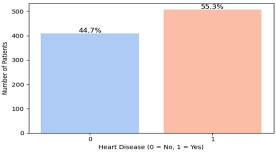 Verifying the distribution of the target variable (presence or absence of cardiovascular disease) (Figure 2) is a crucial step in predictive modeling, as it helps identify potential class imbalance that may negatively affect model performance. In our dataset, the analysis of the “HeartDisease” variable revealed a class imbalance, with 55.3% positive cases (patients with heart disease) and 44.7% negative cases (healthy individuals). This corresponds to an imbalance ratio of approximately 1.24:1, indicating a moderate but non-negligible skew toward the positive class.