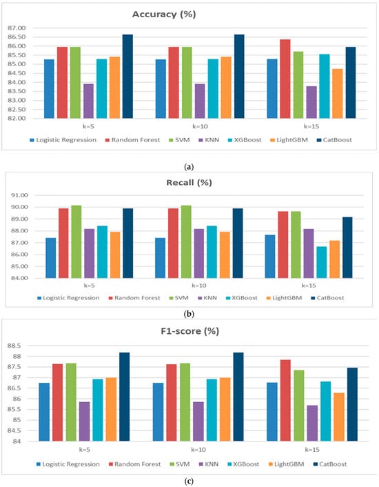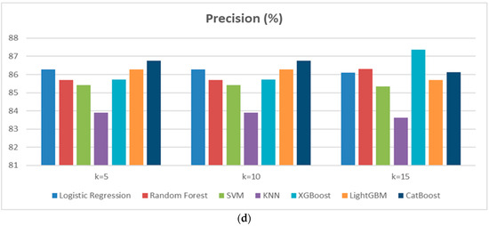 In Scenario 2, a cross-validation approach with K = 5 and K = 15 was applied to assess the performance of the classification models used in Scenario 1. The aim is to analyze the impact of varying the number of folds on cardiovascular disease prediction. Based on the results obtained for both scenarios, it is observed that model performance remains relatively stable, although some variations occur depending on the number of folds (Figure 4a–d). Random Forest performed particularly well, with a high F1-score (87.83% for K = 15) and stable Recall, making it one of the top-performing models. SVM demonstrated good stability with strong scores in Accuracy and F1-score, although a slight decrease in Accuracy was observed for K = 15. CatBoost was also effective, but a slight decrease in Accuracy was noted for K = 10. The impact of increasing the number of folds (from K = 10 to K = 15) showed that Random Forest and SVM benefit from greater stability, while some models, such as KNN and LightGBM, displayed slightly less consistent performance. Overall, cross-validation with K = 10 or K = 15 enhances model robustness, particularly for Random Forest and SVM, reducing the risk of overfitting and ensuring better generalization.
