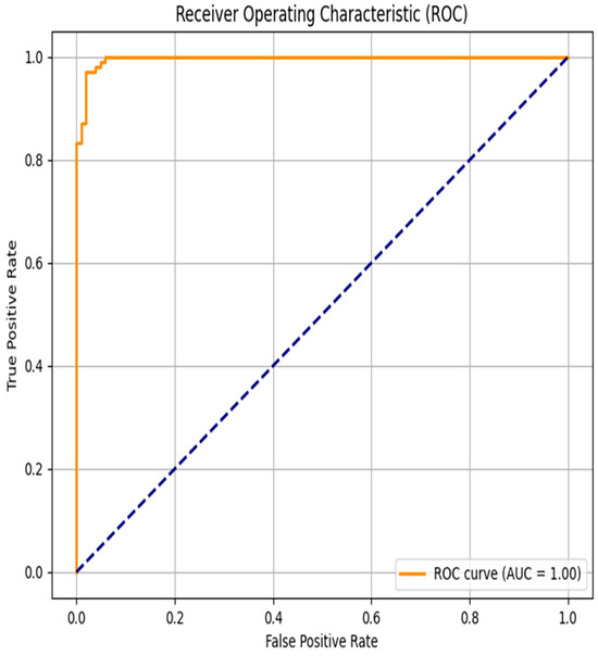 The evaluation of the discriminative performance of the proposed model was conducted using the Receiver Operating Characteristic (ROC) curve, a standard method for visualizing the trade-off between sensitivity (true positive rate) and specificity (1—false positive rate). As shown in Figure 6, the ROC curve follows an almost ideal trajectory, approaching the upper-left corner of the graph, which indicates a high detection rate of positive cases with a very low false alarm rate across a wide range of classification thresholds. The area under the ROC curve (AUC) reaches a perfect score of 1.00, reflecting the model’s exceptional discriminative power—accurately identifying both positive and negative cases without error.