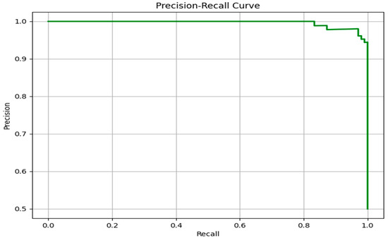 To further evaluate the predictive performance of the proposed model, particularly in the context of class imbalance that often characterizes clinical datasets, the Precision–Recall (PR) curve was analyzed. As illustrated in Figure 7, the PR curve demonstrates an almost flat trajectory near the top of the plot, maintaining a precision close to 1.0 over a wide range of recall values. This indicates that the model is capable of retrieving the majority of true positive cases (high recall) while maintaining a very low rate of false positives (high precision).