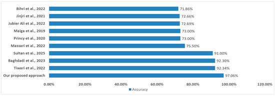 Finally, our proposed model achieves 97.06% accuracy, outperforming all existing approaches (Figure 8) in cardiovascular disease prediction cited in the state of the art. Compared to Tiwari et al. (92.34%), Baghdadi et al. (92.30%), and Sultan et al. (91.00%), our model improves classification accuracy by 4–6%. Other studies show significantly lower performance (71.86–75.50%). These findings highlight the effectiveness of our optimized machine learning approach.
