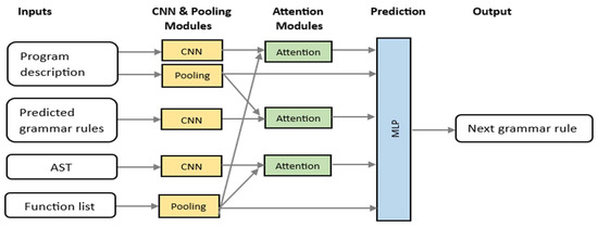 In this model, there are four basic input types to predict the grammar rule: the natural language that describes the program to be generated, the previously predicted grammar rules, the generated AST, and the function list. In our proposed model, although we employ a CNN, which is not inherently designed for sequence modeling, we structure the input in a way that allows the network to effectively capture sequential and contextual dependencies.