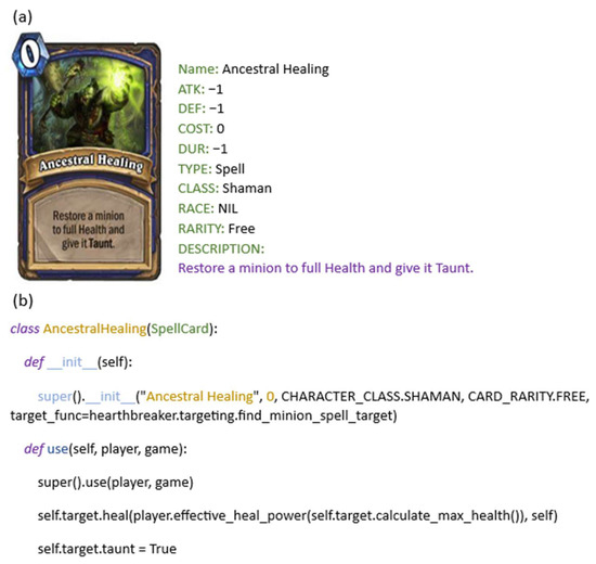 Example card of HEARTHSTONE. (a) Input description: (b) Output program.