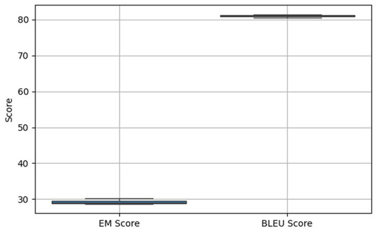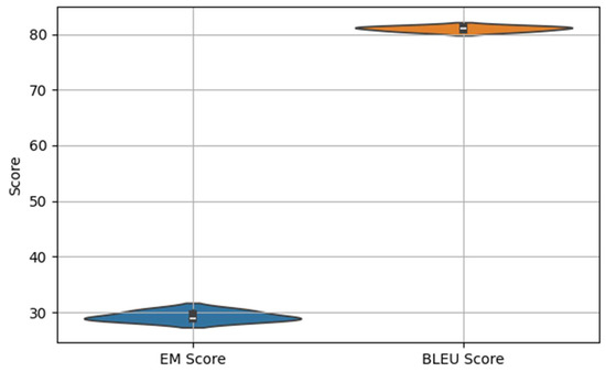 Instead of employing cross-validation, we conducted multiple independent runs of the experiment and reported the average performance across these runs to obtain a robust estimate of the model’s effectiveness. Specifically, we performed three independent runs using the same train-validation-test split but with different model initialization and training parameters. This strategy helps account for the variability introduced by stochastic training processes such as weight initialization and batch ordering. Based on this evaluation, the proposed model achieved an EM score of 29.3 and a BLEU score of 81 on the HEARTHSTONE dataset, demonstrating strong performance in terms of both strict syntactic correctness and overall generation quality. To further evaluate the robustness of our framework, we include a box plot (Figure 7) and a violin plot (Figure 8) to illustrate the distribution of EM and BLEU scores across three independent runs, capturing both the central tendency and variance.
