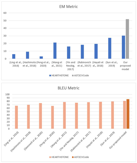 Figure 9 shows the EM and BLUE results of our proposed model compared to other state-of-the-art models. Moreover, Figure 10 and Figure 11 show examples of the generated code by our proposed model for the HEARTHSTONE dataset and AST2CVCode dataset, respectively. In comparison to the reference code, the generated code uses different variables but maintains the correct functionality.