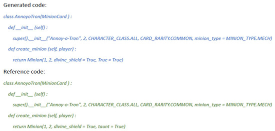 Data quality limitations affect the model’s performance; these limitations include domain-specific language and keywords. HEARTHSTONE uses specialized terms and keywords (e.g., “Battlecry” and “Deathrattle”) that may not be well understood by general-purpose code generation models. Misinterpretation of these terms leads to code that does not reflect the intended card functionality. We resolve this issue by fine-tuning the model with HEARTHSTONE-specific terminology and syntax, so it learns to recognize and handle these terms correctly. Addressing these data quality limitations with a careful fine-tuning approach improves the accuracy and robustness of our proposed model for the HEARTHSTONE dataset, leading to better performance and consistency in real-world applications.