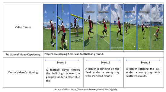Dense video captioning (DVC) offers a solution to the limitations of conventional video captioning methods by enabling the analysis of videos containing multiple events. Unlike traditional approaches that generate a single, generic caption for an entire video, DVC is capable of identifying, segmenting, and distinguishing between overlapping or sequential events. Once these events are detected, a captioning module produces a detailed description for each one. As shown in Figure 1 conventional models summarize the video as a whole, whereas DVC provides fine-grained captions for individual events. This automated approach to event detection and caption generation has numerous practical applications, such as video summarization [1,2,3], content-based video retrieval [4], query-based video segment localization [5,6], visual assistance for the visually impaired [7], and the creation of instructional videos [8].