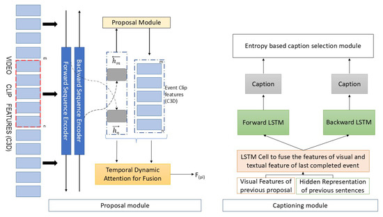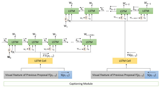 In Equation (3), represents the C3D features of the detected event. represents the C3D feature of an event that starts at the m time stamp and ends at the n time stamp. represents the context vector in a forward direction, while represents the context vector in a backward direction. All these features, along with the previous hidden state of the LSTM (), are fed into the captioning module. Temporal dynamic attention is applied to identify key visual features (C3D) using context vectors, helping to recognize important frames. The integration of context vectors with C3D features enhances the model’s ability to understand the event’s context more effectively. The relevance score at each time step t is calculated using the following equation: