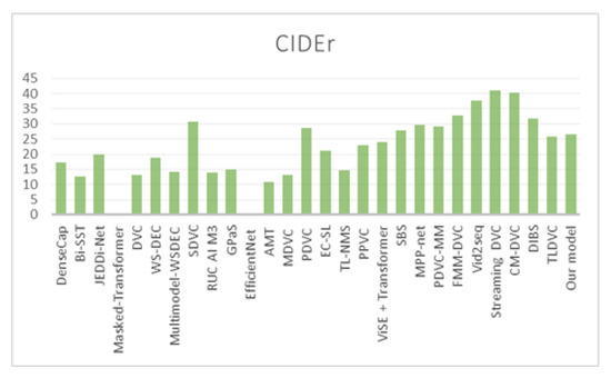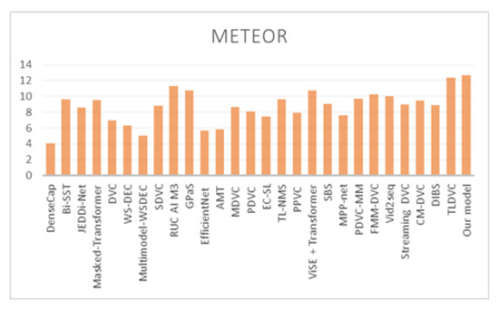 The mean-based caption selection method showed improved performance as sentence length increased, particularly for extended n-gram matches. While our model achieved significant gains in the CIDEr score compared to the baseline model [21], further evaluation is required using transformer-based visual feature extraction models. Figure 5 and Figure 6 illustrate the performance of the proposed model (DVC-DCSL) compared to other state-of-the-art dense video captioning models using the METEOR and CIDEr evaluation metrics. The higher value of the METEOR score indicates better synonym matching and overall caption quality. The CIDEr score evaluates the consensus between generated and reference captions based on TF-IDF weighting. The results demonstrate that the DVC-DCSL model outperforms existing approaches, challenges remain in achieving higher CIDEr scores. This indicates that enhancing the alignment between visual and textual features is a promising direction for improving caption generation in future research.