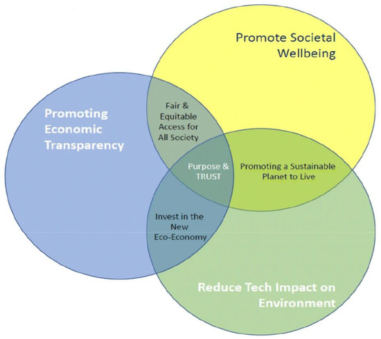 Special emphasis is placed on CDR in fintechs and financial institutions driven by AI, where it can act as a potential framework to navigate through complexities of RAI and as a means of codifying trust, which then becomes practically valuable; CDR is seen to have the potential to assist financial services in embedding “purpose and trust” and in driving RAI adoption (Elliot et al. [5]: 185). This is particularly critical as, according to an Edelman survey of trusted sectors between 2015 and 2019, the financial services sector emerges as the least trusted sector [30]. If financial services are bracing to reap the potential rewards of the AI and GenAI capabilities, then they need to do it in a trustworthy manner or face risks of alienation from customers. Trust, transparency, ethics, purpose, and a culture of accountability cannot be embedded merely through externally dictated technical or legal enforcements but can be better addressed by understanding non-technical (employee-related, procedural-operational, organisational, and environmental) challenges and putting into practice robust AI governance mechanisms. In this respect, CDR is more holistic at an organisational level, as illustrated in Figure 3, encompassing three dimensions with trust and purpose firmly sitting in the middle, making it ever more crucial in the AI-infused era: managing the environmental impact of technology, ensuring societal well-being, and promoting economic transparency.