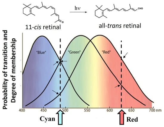 In Equation (3), ψ e and ψ v refer to the electronic and vibrational wavefunctions of the ground (i) and excited states (f). The three absorption bands correspond to three molecular fuzzy sets that granulate the visible spectral region. Lights of distinct colours, i.e., those having different spectral compositions, are absorbed by the three proteins with different probabilities, these values being related to the extent of the three transition moment integrals (Equation (3)), whose values are wavelength-dependent. In terms of fuzzy sets, lights with distinct hues belong to the three chemical fuzzy sets with different degrees of membership. These diverse degrees of membership or probabilities of absorption constitute the first clue used for distinguishing among hues within the human brain. The granulation of the visible region is a form of quantum parallelism that enables humans to distinguish around 200 hues.