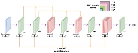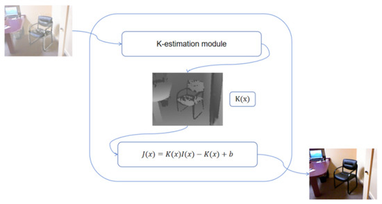 1] proposed to integrate the atmospheric light value A and the transmission map t(x) into a unified variable K(x), resulting in Equation (3):