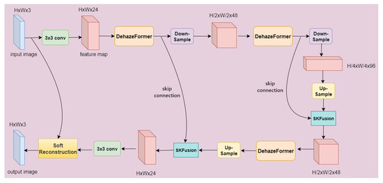 Figure 3, the overall model architecture adopts a U-Net symmetric structure, where convolution blocks are replaced by DehazeFormer modules. It alternately extracts features through 3 × 3 convolutions and DehazeFormer modules, and constructs multi-scale representations by combining downsampling. In the decoding stage, residual connections are used to transmit features across layers to preserve details, SKFusion is employed to dynamically fuse information from different branches, and the DehazeFormer module is applied again to enhance feature modeling capabilities. Finally, a clear image is output through upsampling and Soft Reconstruction. This design innovatively integrates the local perception advantages of CNNs with the global modeling capabilities of Transformers, and in conjunction with a selective feature fusion mechanism, effectively improves the image recovery performance in complex degraded scenarios.