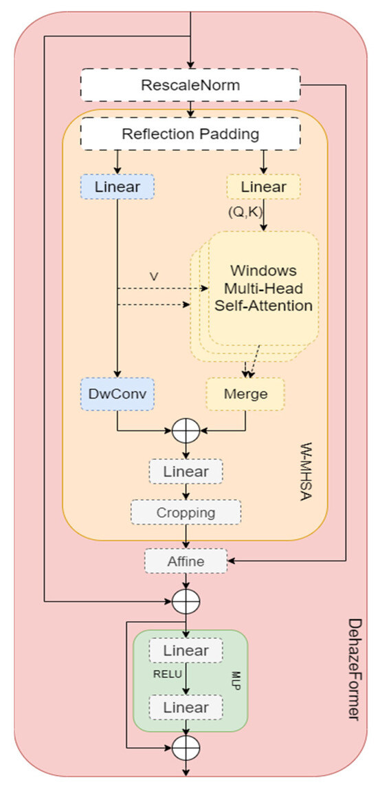 The image dehazing method based on DehazeFormer constructs an image dehazing network using a Transformer–CNN hybrid architecture. The core idea of this algorithm is to recover clear images from foggy images through multi-scale feature extraction and physical model-driven approaches. As shown in the overall flowchart of the DehazeFormer algorithm in