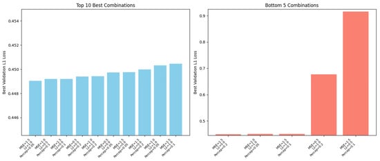 Figure 5; the abscissa of the bar chart represents the weight combinations, and the ordinate represents the minimum L loss value of each combination on the validation set. It displays the top 10 and bottom five combinations sorted by L1 loss in ascending order. It can be clearly observed that within the given research range, the optimal weight ratio