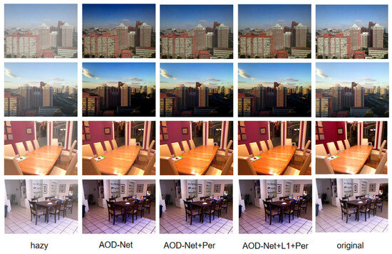 In the outdoor subset test, the original AOD-Net model established its baseline performance with a PSNR of 28.9374 dB, SSIM of 0.8964, VSNR of 9.14 dB, and LPIPS of 0.1467, where the lower LPIPS value confirms the algorithm’s superiority in perceptual quality. When a perceptual loss (weight: 0.1) was introduced on top of the original MSE loss, the model showed improvements of 0.9908 dB in PSNR, 0.0719 in SSIM, and 0.73 dB in VSNR, while the LPIPS score decreased by 0.0513 to 0.0954, demonstrating the perceptual loss’s enhancement of feature representation. Further adopting a ternary composite loss function—combining MSE (1.5), perceptual loss (0.05), and L1 regularization (1.0)—the model achieved peak performance with 29.9912 dB PSNR, 0.9716 SSIM, and 10.02 dB VSNR, while the LPIPS improved by 0.0026 to 0.0928, marking a 36.74% reduction compared to the initial value. This highlights the effectiveness of multi-loss collaborative optimization.