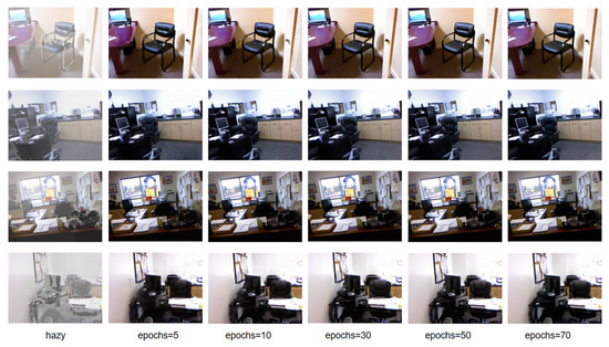 Table 2, multi-stage training evaluations were conducted on the ITS indoor dataset: model snapshots were saved every 20 training cycles (epoch = 10/30/50/70), constructing an evaluation queue containing four candidate models. Quantitative evaluation shows that the model trained for 50 epochs achieves the highest values in both PSNR and SSIM metrics on the ITS validation set. Its average PSNR (37.83 dB) increased by 5.6% compared to the 30-epoch model, and the maximum SSIM value exceeded the 0.999 threshold, verifying the optimal balance point for model convergence.