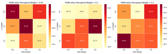 Figure 8. The darker the color, the larger the PSNR and the better the dehazing performance. Fixing the perceptual loss weight, the influences of MSE loss and L1 loss on the dehazing performance of the model are shown through the heatmap, and the optimal weight ratio