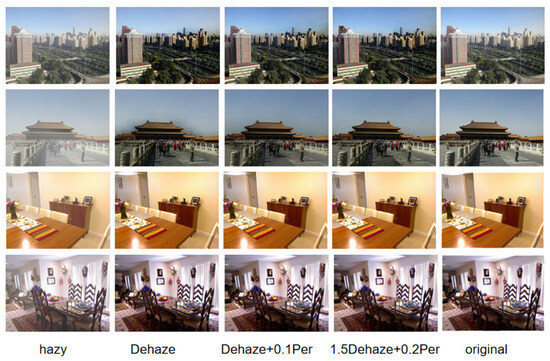 is 1.5:0.0:0.2. By observation, when the perceptual loss weight is 0.05, the overall PSNR ranges from 18.30 to 19.34. When the perceptual loss is increased to 0.1, the overall PSNR is improved, ranging from 18.77 to 19.68. When the perceptual loss is 0.2, the overall data interval is between 18.24 and 19.91, with a peak value, but the difference between the data increases. Through the analysis of this figure, we believe that there is no single loss function that completely affects the trend of the model’s dehazing performance. The model’s dehazing performance is affected by the combined action of all loss functions during training. However, for the DehazeFormer model, the L1 loss function has a greater impact on it.