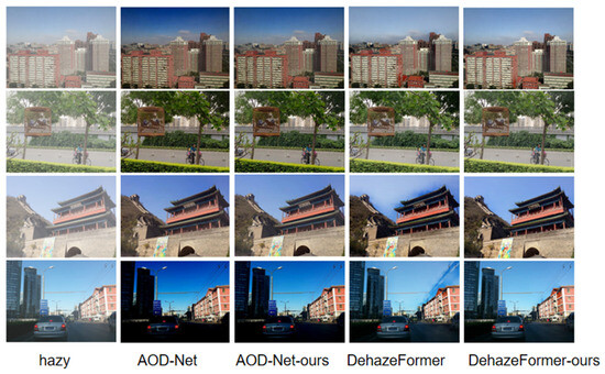 The innovative contributions of this paper are mainly reflected in three aspects: (1) designing a composite loss function for AOD-Net, integrating perceptual loss and L1 regularization to significantly enhance the model’s adaptability to fog concentration gradient changes, with the loss weight combination determined through grid search; (2) proposing a multi-constraint optimization objective for DehazeFormer, integrating MSE (Mean Squared Error) and perceptual loss to effectively improve the color fidelity of the algorithm in complex scenarios; and (3) establishing a multi-dimensional evaluation framework covering computational efficiency, restoration quality (PSNR, SSIM, VSNR, and LPIPS), etc., to provide a scientific decision-making basis for the selection of industrial-grade dehazing systems.