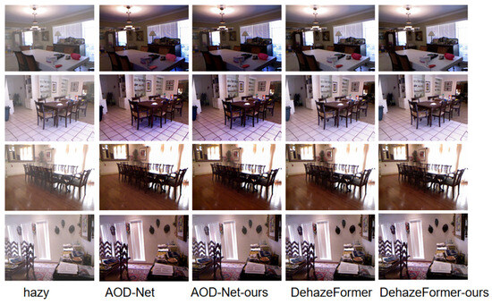 Figure 11, respectively, display the dehazed images generated by the algorithms used in this study on the SOTS-outdoor and SOTS-indoor datasets. Through comparative observation, it can be visually determined that the CNN-based dehazing algorithm underperforms the latter two algorithms on these datasets. Although the images produced by this algorithm can partially restore colors, textures, and structures, they generally exhibit blurred object contours.