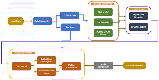 Figure 1 presents the overall research framework designed for this study. It outlines the step-by-step process from data preparation to model training, evaluation, and final recommendation, highlighting the use of DQN-based architectures, exploration techniques, and performance metrics in the context of the NIFTY 50 index.