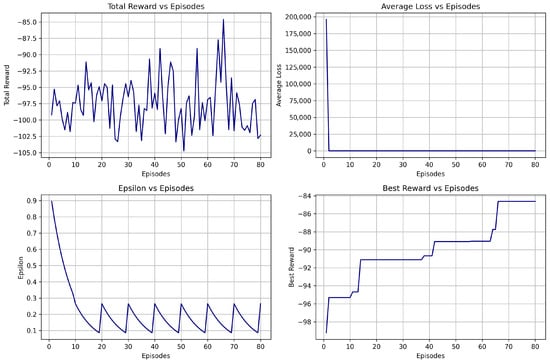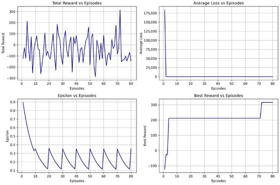 The Dueling DDQN model extends the DDQN framework by introducing separate value and advantage streams in the neural network architecture to better distinguish between the value of a state and the advantage of specific actions (see Section 4 and Equation (4)). This design helps the agent identify valuable states even when action differences are minimal, thereby improving learning efficiency. As with the other models, the Dueling DDQN architecture employs prioritized experience replay, epsilon-greedy exploration, and the same reward structure with trade penalties.