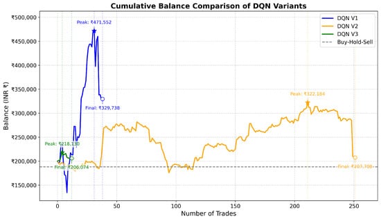 While DQN (V1) executed the highest number of trades (38), it delivered a relatively low Sharpe ratio (0.097) and a modest mean PnL of INR 3414.15 (∼USD 39.50). The wide 95% CI (INR −8416.31, INR 14,265.13) suggests considerable variability and the potential for negative returns. DDQN (V3) demonstrated improved performance, with 15 trades and a higher win rate of 73.33%. It achieved a mean PnL of INR 4677.06 (∼USD 54.10) and a narrower CI (INR 1739.27, INR 8071.12), offering greater statistical confidence in its profitability. Its Sharpe ratio of 0.739 confirms an improved risk–return trade-off. Dueling DDQN (V3) achieved the highest mean PnL of INR 18,196.25 (∼USD 210.60) and Sharpe ratio of 1.228. However, this was based on just three trades, all profitable. Consequently, the profit factor is undefined (NA) due to the absence of any losses, and the 95% CI (INR 4294.68, INR 38,730.00) is extremely wide, underscoring the statistical uncertainty. This highlights the need for caution when interpreting metrics based on sparse trades.