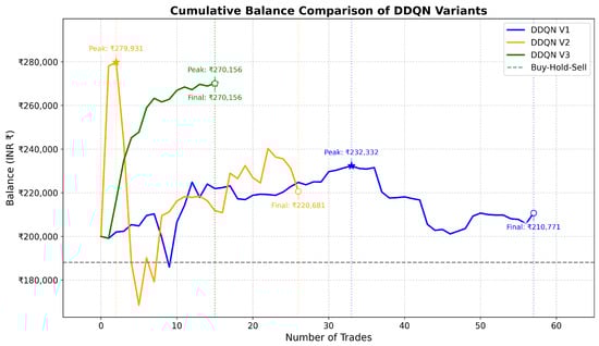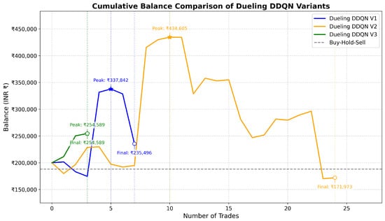 Equity curve comparison of Dueling DDQN variants. This plot highlights differences in capital growth across the three Dueling DDQN models, reflecting their trade frequency and quality.