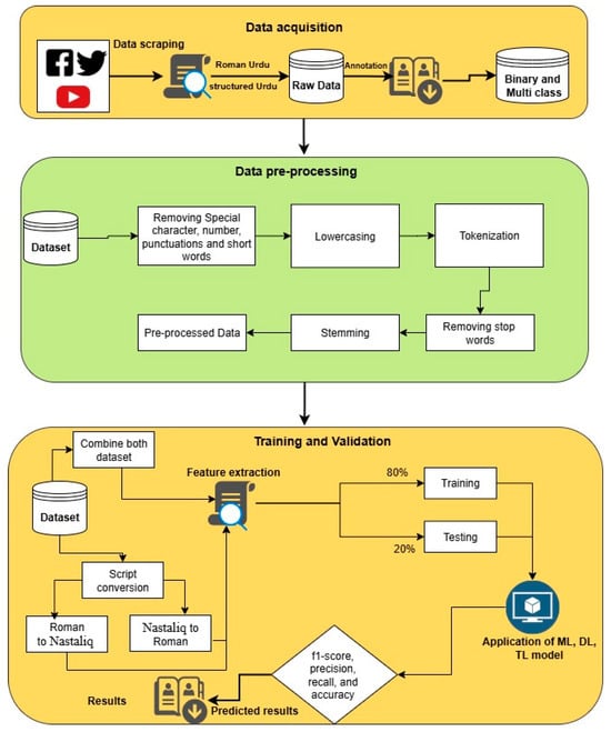 After collecting user posts, we carefully analyzed and preprocessed the data, as this step was crucial. Social media data often contain noise, links, and hashtags, which can lead to incorrect results for machine learning and deep learning models. In this study, the process begins with text cleaning, where special characters, numbers, punctuation, and short words are removed. Additionally, duplicate tweets and tweets with fewer than 20 characters were also removed. Next, all text is converted to lowercase to ensure consistency in a language. Tokenization is performed to break the text into individual words or subwords. After tokenization, we apply stop word removal, followed by stemming or lemmatization. After these preprocessing steps, the cleaned and standardized text is ready for further processing and model training. As a result of these techniques, only 8000 code-mixed Roman Urdu and Nastaliq Urdu sentences remained for annotation, as shown in Figure 2. Following preprocessing, an 80-20 split was employed in all experiments, with 80% of the data used for training and validation and the remaining 20% reserved for testing. For machine learning models, we applied feature extraction using term frequency-inverse document frequency (TF-IDF) for whole-word representations. For deep learning models, we used pretrained word embeddings, such as FastText and GloVe. Additionally, for transfer learning, we applied advanced language-based contextual embeddings to capture hidden patterns in both code-mixed Roman Urdu and Standard Urdu without modifying the vocabulary.
