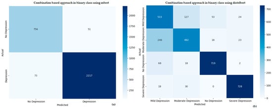 Figure 9 shows confusion matrices for the combination-based approach used in both binary and multiclass depression classification tasks. In Figure 9a, the confusion matrix represents the binary classification results using mBERT. The model achieved strong performance by correctly identifying 756 “No Depression” and 2217 “Depression” instances. Only 73 depressed tweets were misclassified as non-depressed, and 51 non-depressed tweets were labeled as depressed—indicating high Precision and Recall, particularly for the depression class.