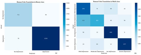 Figure 10 presents two confusion matrices illustrating the performance of depression classification models applied to Roman Urdu text translations. Figure 10a shows the results for a binary classification task distinguishing between “Depression” and “No Depression.” The model correctly identified 2250 instances of depression and 711 instances of no depression, while misclassifying 78 depressive and 58 non-depressive cases, indicating strong performance. Figure 10b extends this to a multiclass classification scenario, differentiating between “Mild Depression,” “Moderate Depression,” “No Depression,” and “Severe Depression.” The confusion matrix reveals a more complex classification landscape with frequent misclassifications, particularly between mild and moderate depression (e.g., 315 actual “Mild Depression” samples were predicted as “Moderate Depression”). Despite this, the model still achieved strong predictions for “No Depression” (692 correct) and “Severe Depression” (677 correct). Overall, the binary model demonstrates higher accuracy, while the multiclass model captures finer-grained distinctions at the cost of increased confusion between similar categories.