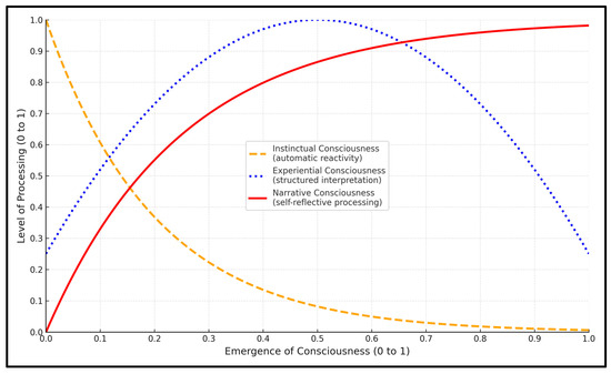 Further, Figure 1 illustrates the continuous emergence of consciousness, hypothetically depicting how different levels of processing shift as the system moves from instinctual responses to fully developed self-referential awareness. The x-axis represents the progression from minimal to advanced consciousness (from 0 to 1), while the y-axis represents the level of processing normalized to a value between 0 and 1. At the earliest stages of consciousness, basic awareness (instinctual awareness) is dominant. This form of consciousness is characterized by autonomic responses, where processing is mainly reactive and governed by sensorimotor functions. As new forms of consciousness emerge, instinctual consciousness becomes less dominant, reflecting its diminishing role in shaping experience. At this point, experiential awareness takes prominence, marking the transition from autonomic reactions to structured interpretations of sensory input. The system begins to integrate environmental and internal signals, forming meaningful experiences rather than just responding reflexively, peaking around the mid-range of the consciousness spectrum, where the system reaches its highest capacity for direct experiential understanding before higher-order processes and automatization take over. As we approach narrative consciousness, self-referential processing becomes increasingly dominant. Initially negligible, this form of processing grows as the system develops the ability to construct a coherent self-narrative. It integrates past experiences, present context, and future projections into a unified identity, allowing for intentional decision-making and abstract thought. As self-referential processing reaches its peak, experiential awareness declines, suggesting that raw experience is progressively automatized or structured into reflective, conceptual cognition.