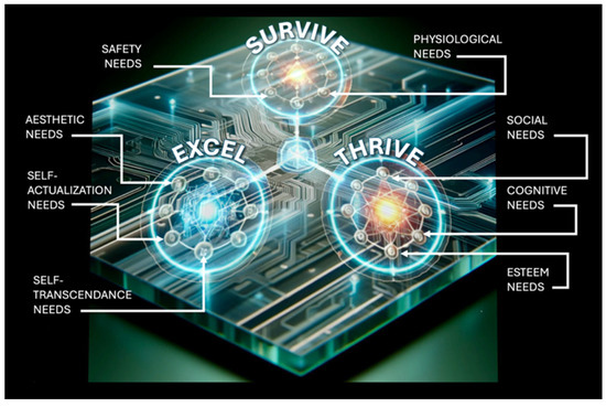 Wang and colleagues [42] have shown that artificial intelligence systems incorporating needs-based consciousness can mimic human-like behaviour. Their proof-of-concept article highlights the importance of internal motivational dynamics, but lacks a comprehensive framework that integrates both empirical validation and educational application. Table 3 illustrates that one way to strengthen such a model is to distinguish among different classes of needs, each aligned with specific regulatory functions. For the Survive regulator, Maslow’s foundational insights [43] into physiological and safety needs remain useful by providing a structured account of the imperatives for system integrity, environmental stability, and protection from threat. In contrast, for the Thrive and Excel regulators, a more empirically grounded approach is found in Self-Determination Theory (SDT). Developed by Deci and Ryan, SDT identifies three basic psychological needs: autonomy, competence, and relatedness. These map naturally onto systems designed for adaptive engagement (Thrive) and long-term developmental growth (Excel). Autonomy and relatedness help AI systems interact with others in socially aware and self-directed ways, while competence supports their ability to learn new skills and adapt to different situations. Importantly, SDT does not stop at self-fulfilment: by enabling agents to pursue intrinsically meaningful and prosocial goals, it provides a natural bridge to transcendent capacities such as ethical reasoning, future-oriented planning, and value-aligned self-regulation, which are key functions of the Excel regulator. Together, Maslow and SDT offer a layered motivational architecture that informs both biological plausibility and synthetic implementability.