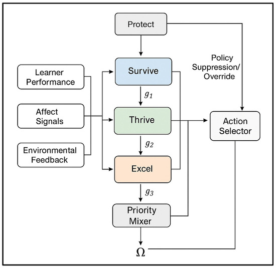 Figure 3 below outlines a proposed modular architecture for a Needs-Driven AI tutor, where environmental inputs (e.g., student performance, emotional signals, and ethical rules) feed into perception and memory subsystems. These update the satisfaction levels for each regulator (Survive, Thrive, Excel). Each regulator computes a need gradient dynamically influencing the action selector through soft-attention weighting. A Protect regulator oversees the conflict intensity signal Ω, triggering overrides when ethical or safety thresholds are exceeded. The selected action is then logged, executed, and fed back into the system’s memory.