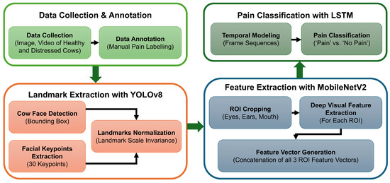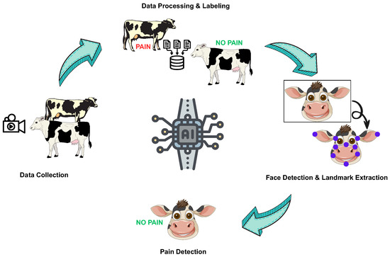 In this paper, we propose an automated pain detection pipeline for dairy cattle, as shown in the summarized framework in Figure 2. We started our work with image and video data collection from several dairy farms across Canada. Each data point was processed, annotated (as ‘pain’ or ‘no pain’), and stored securely with all of the relevant information. The labeled data was then processed to extract consecutive frames, and cows’ faces were detected in bounding boxes from each frame. Once a face had been detected, 30 facial landmarks (i.e., keypoints) were labeled on the face, and temporal modeling was applied to consecutive frames. Then, the pain detection model analyzed these landmarks to classify the data as ‘pain’ or ‘no pain’. The complete process from data collection to pain detection is explained in this section.