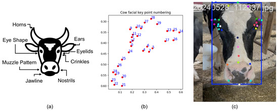 (a) A few regions of a cow’s face and head. (b) A sample set of 30 keypoints. (c) A sample image of a cow’s face with the keypoints.