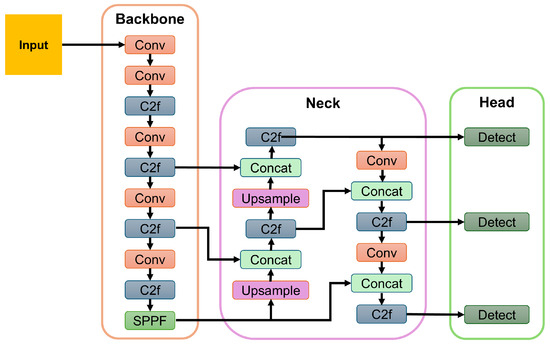 A sample block diagram of the YOLOv8 model. Here, Conv = Convolutional Layer; C2f = Cross-Stage Partial Fusion; and SPPF = Spatial Pyramid Pooling Fast.