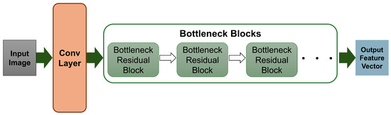 - Stage 2: Each ROI (i.e., cropped region from every 1 of the 3 areas) was passed through a pretrained MobileNetV2 [46] convolutional neural network for deep visual feature extraction, chosen for its lightweight architecture and strong feature extraction capabilities. MobileNetV2 employs depthwise separable convolutions and inverted residual blocks, which reduce the computational complexity while preserving representational power. A sample MobileNetV2 block diagram is shown in Figure 5 [51]. Although MobileNetV2 is a classifier, here, it was used without the classification head for application as a deep visual feature extraction tool. From each of the three ROIs, a 1280-dimensional feature vector was extracted, resulting in a concatenated 3840-dimensional feature vector per frame that encapsulated the detailed local facial information.