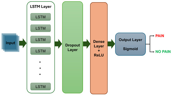 The temporal classification model was implemented using the Keras deep learning framework. It consisted of a single LSTM layer with 128 hidden units, designed to capture temporal dependencies and patterns in the sequential data. The input shape (i.e., shape of one sequence sample) was defined by the number of time steps per sequence (i.e., 5 consecutive frames) and the number of features per time step (i.e., a 3840-dimensional feature vector). To prevent overfitting, a dropout layer was applied after the LSTM layer. The output was then passed through a fully connected dense layer with 64 ReLU-activated units, culminating in a logistic sigmoid activation function to provide the classification probability indicating the presence or absence of pain. Figure 6 shows a block diagram of the LSTM model.