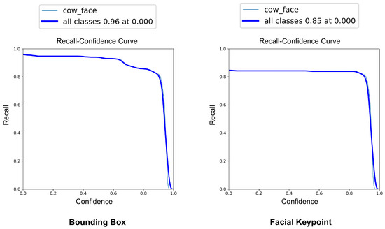 Recall vs. confidence curves for YOLOv8-based cow face detection and keypoint detection.