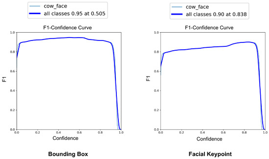 The YOLOv8-Pose model demonstrated exceptional localization capabilities. At a confidence threshold of 0.969, the model achieved a bounding box precision of 1.00, indicating no false positives at this threshold. The recall was 0.96 at a threshold of 0.0, reflecting the model’s ability to detect nearly all true cow faces across the dataset. The F1-score, which balances precision and recall, peaked at 0.95 around a confidence value of 0.505, suggesting a robust performance across varying thresholds. These results are visualized in Figure 7, Figure 8 and Figure 9, which display the precision, recall, and F1-score curves, respectively, as functions of the model’s confidence output.
